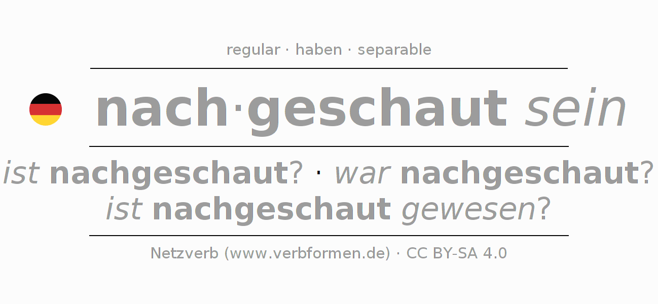Examples for using the conjugation of the verb nachschauen. These are real sentences and sentences from the project Tatoeba. For each conjugated form, such a sentence example is displayed. The verb form is highlighted. If there are more than one sentence, an example with the German verb nachschauen is selected. In order to understand the conjugation not only by the examples, but also to train, worksheets for the verb nachschauen are available.