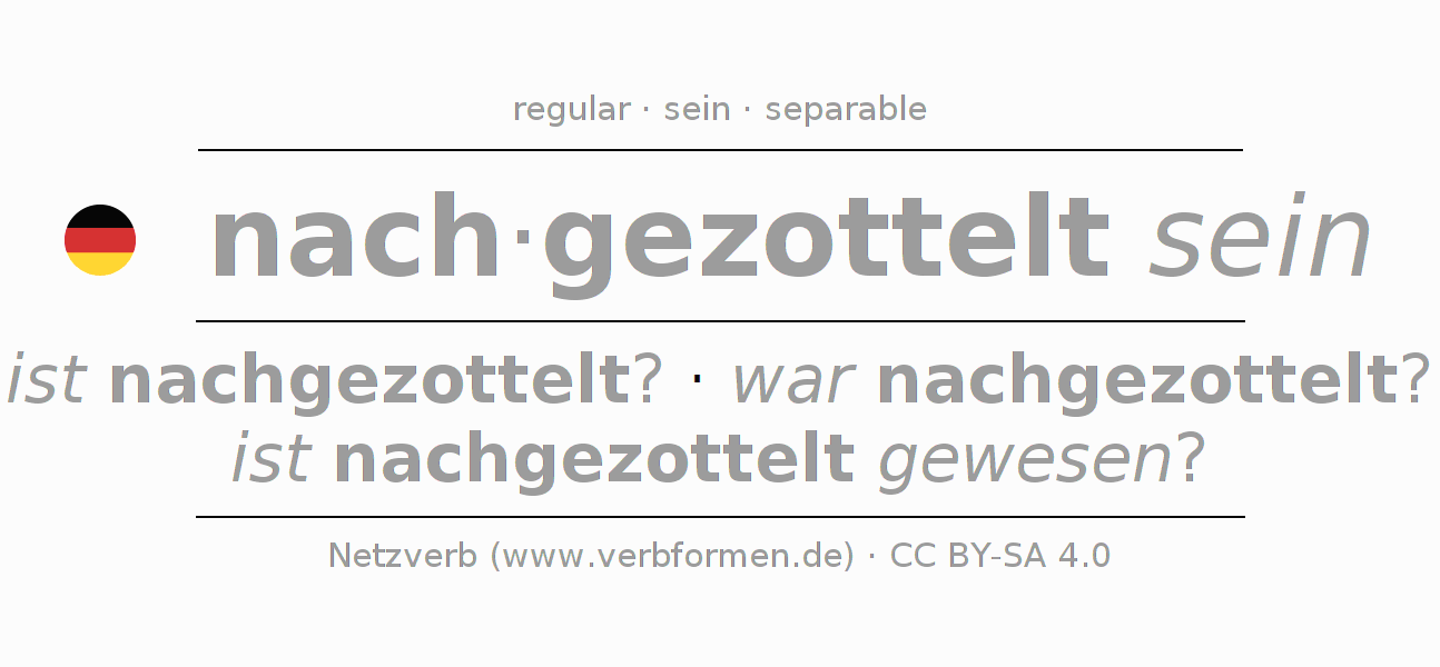 Examples for using the conjugation of the verb nachzotteln. These are real sentences and sentences from the project Tatoeba. For each conjugated form, such a sentence example is displayed. The verb form is highlighted. If there are more than one sentence, an example with the German verb nachzotteln is selected. In order to understand the conjugation not only by the examples, but also to train, worksheets for the verb nachzotteln are available.