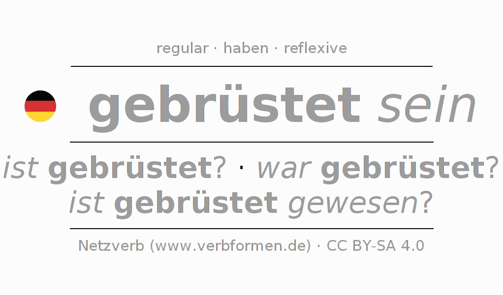 Examples for using the conjugation of the verb brüsten. These are real sentences and sentences from the project Tatoeba. For each conjugated form, such a sentence example is displayed. The verb form is highlighted. If there are more than one sentence, an example with the German verb sich brüsten is selected. In order to understand the conjugation not only by the examples, but also to train, worksheets for the verb brüsten are available.