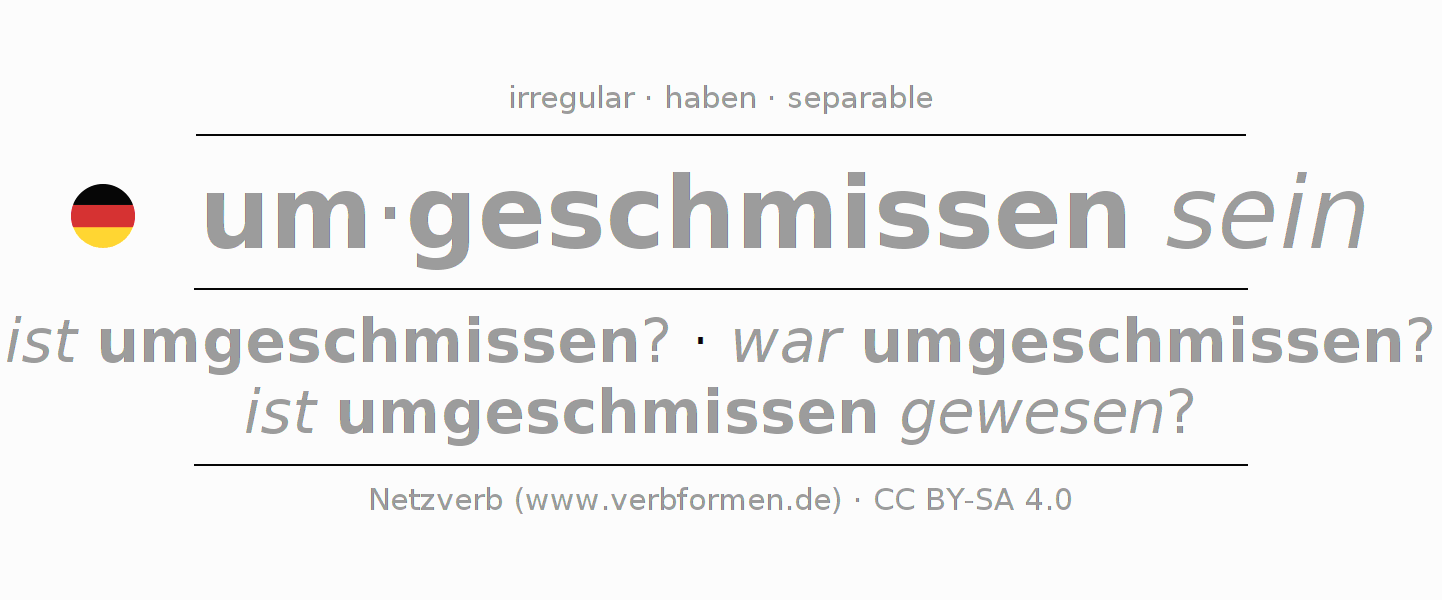 Examples for using the conjugation of the verb umschmeißen. These are real sentences and sentences from the project Tatoeba. For each conjugated form, such a sentence example is displayed. The verb form is highlighted. If there are more than one sentence, an example with the German verb umschmeißen is selected. In order to understand the conjugation not only by the examples, but also to train, worksheets for the verb umschmeißen are available.