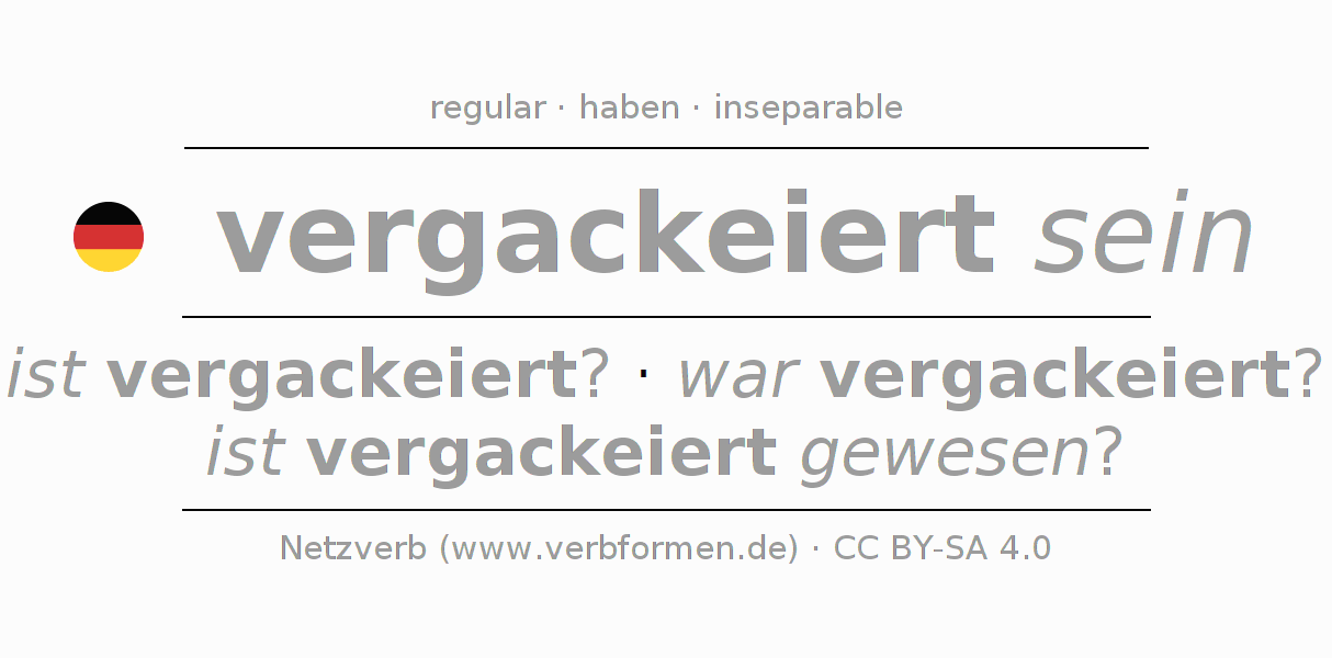 Examples for using the conjugation of the verb vergackeiern. These are real sentences and sentences from the project Tatoeba. For each conjugated form, such a sentence example is displayed. The verb form is highlighted. If there are more than one sentence, an example with the German verb vergackeiern is selected. In order to understand the conjugation not only by the examples, but also to train, worksheets for the verb vergackeiern are available.