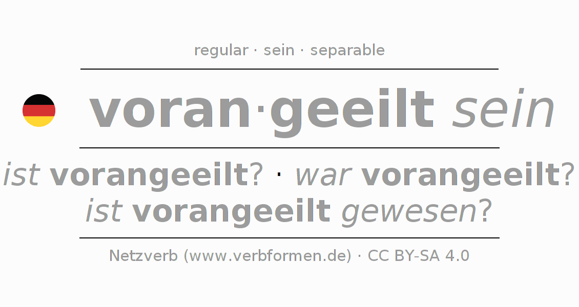 Examples for using the conjugation of the verb voraneilen. These are real sentences and sentences from the project Tatoeba. For each conjugated form, such a sentence example is displayed. The verb form is highlighted. If there are more than one sentence, an example with the German verb voraneilen is selected. In order to understand the conjugation not only by the examples, but also to train, worksheets for the verb voraneilen are available.