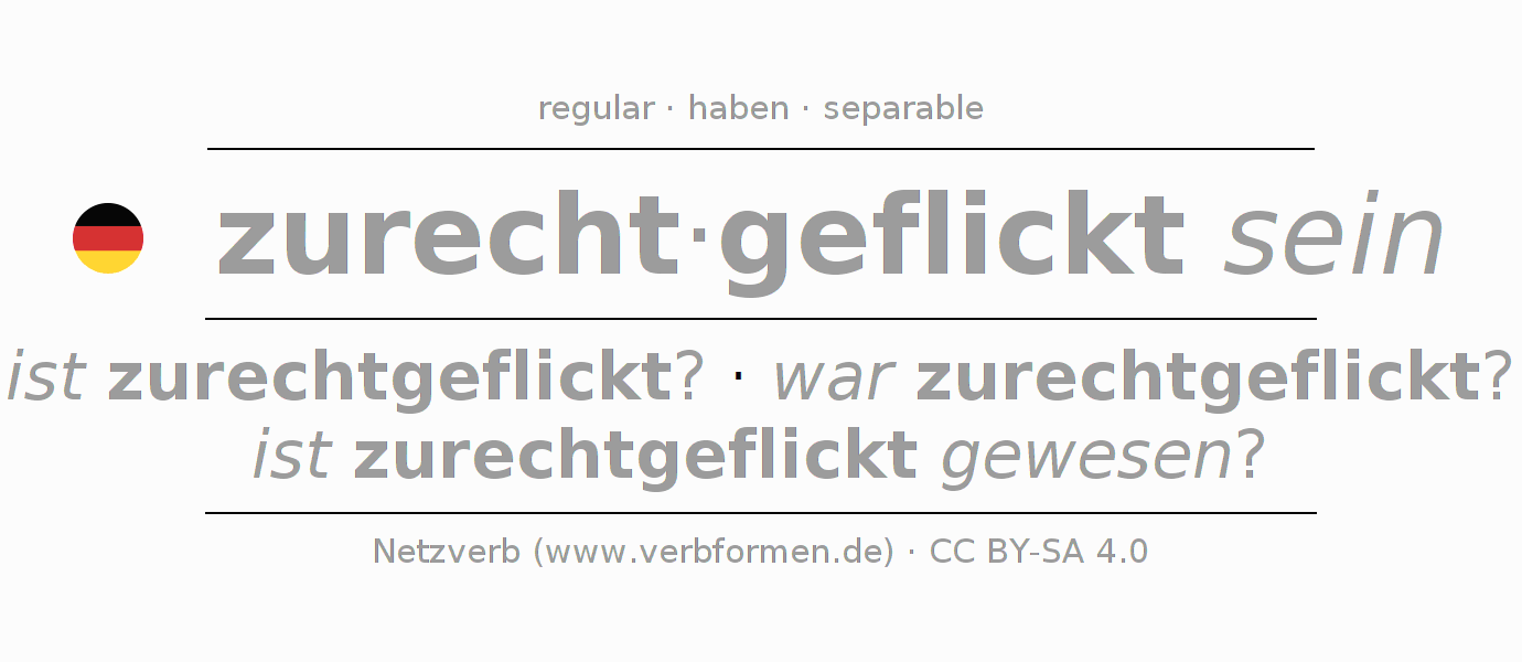 Examples for using the conjugation of the verb zurechtflicken. These are real sentences and sentences from the project Tatoeba. For each conjugated form, such a sentence example is displayed. The verb form is highlighted. If there are more than one sentence, an example with the German verb zurechtflicken is selected. In order to understand the conjugation not only by the examples, but also to train, worksheets for the verb zurechtflicken are available.