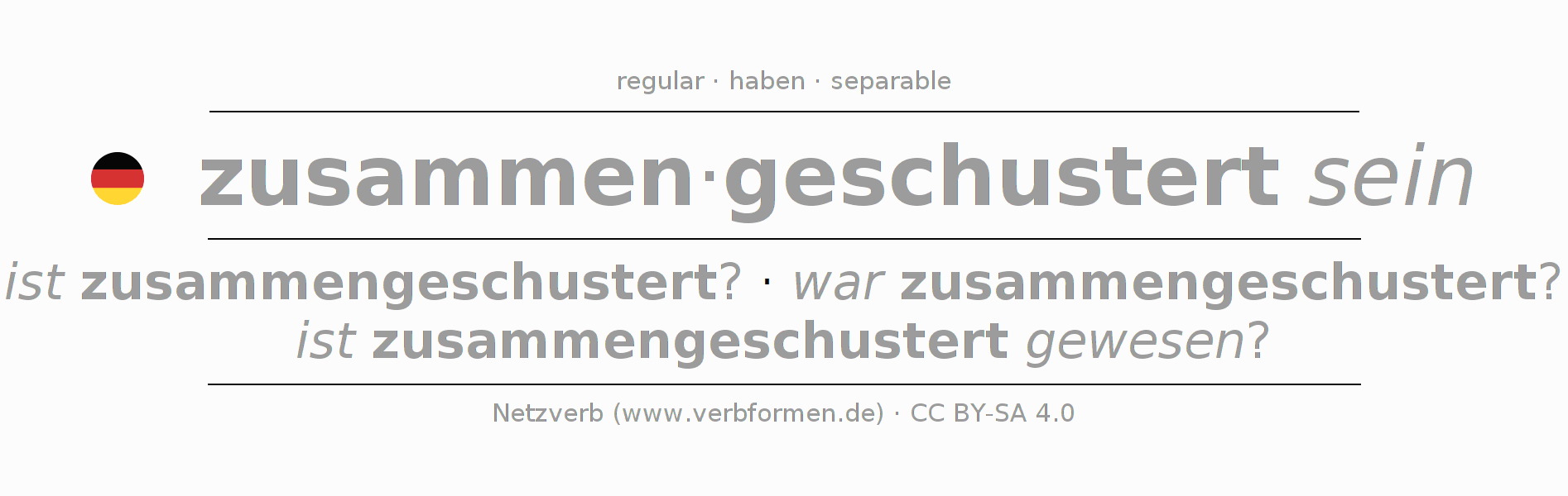 Examples for using the conjugation of the verb zusammenschustern. These are real sentences and sentences from the project Tatoeba. For each conjugated form, such a sentence example is displayed. The verb form is highlighted. If there are more than one sentence, an example with the German verb zusammenschustern is selected. In order to understand the conjugation not only by the examples, but also to train, worksheets for the verb zusammenschustern are available.
