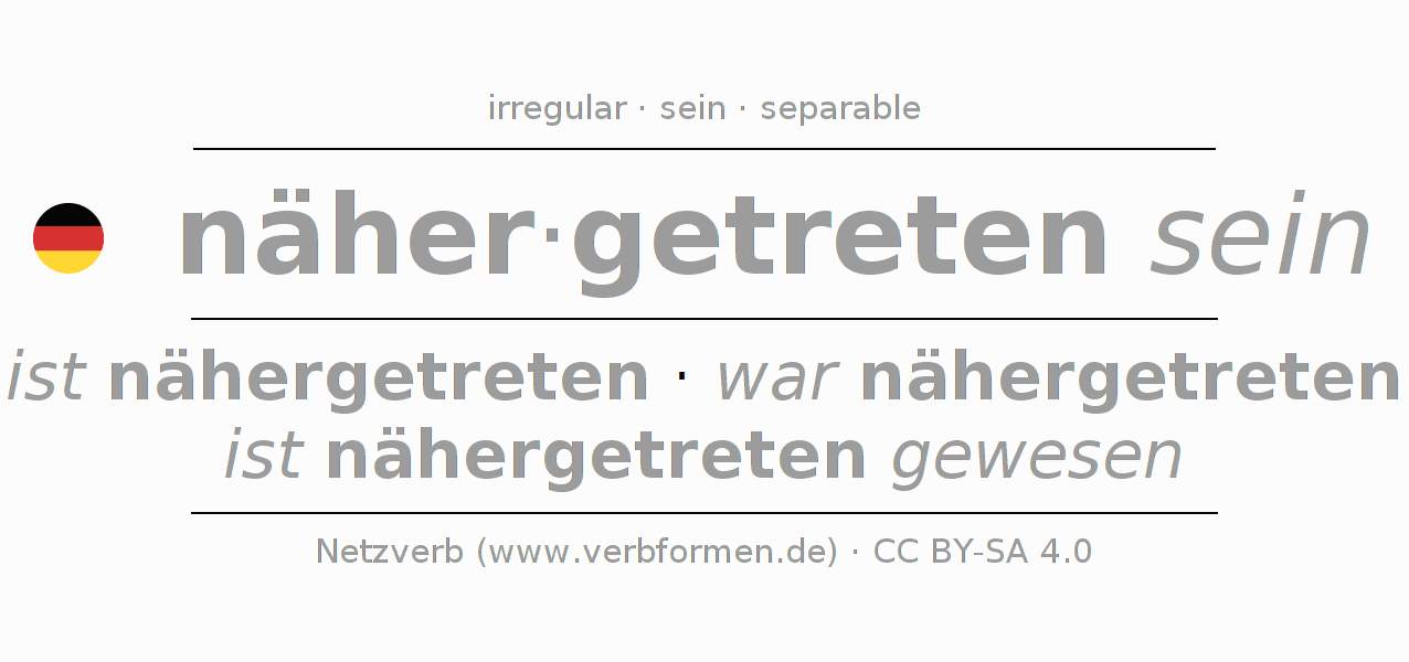 Examples for using the conjugation of the verb nähertreten. These are real sentences and sentences from the project Tatoeba. For each conjugated form, such a sentence example is displayed. The verb form is highlighted. If there are more than one sentence, an example with the German verb nähertreten is selected. In order to understand the conjugation not only by the examples, but also to train, worksheets for the verb nähertreten are available.