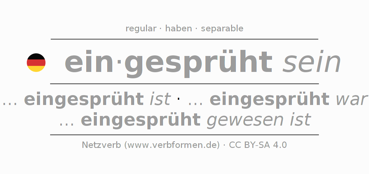 Examples for using the conjugation of the verb einsprühen. These are real sentences and sentences from the project Tatoeba. For each conjugated form, such a sentence example is displayed. The verb form is highlighted. If there are more than one sentence, an example with the German verb einsprühen is selected. In order to understand the conjugation not only by the examples, but also to train, worksheets for the verb einsprühen are available.