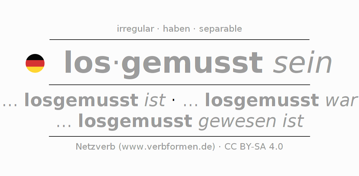 Examples for using the conjugation of the verb losmüssen. These are real sentences and sentences from the project Tatoeba. For each conjugated form, such a sentence example is displayed. The verb form is highlighted. If there are more than one sentence, an example with the German verb losmüssen is selected. In order to understand the conjugation not only by the examples, but also to train, worksheets for the verb losmüssen are available.