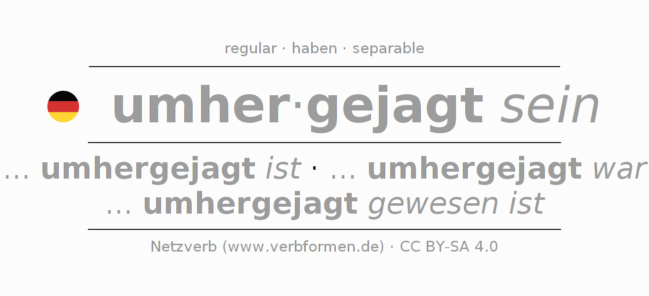 Examples for using the conjugation of the verb umherjagen. These are real sentences and sentences from the project Tatoeba. For each conjugated form, such a sentence example is displayed. The verb form is highlighted. If there are more than one sentence, an example with the German verb umherjagen (hat) is selected. In order to understand the conjugation not only by the examples, but also to train, worksheets for the verb umherjagen are available.