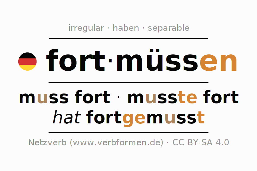 - Future: ich werde fortmüssen, du werdest fortmüssen, er werde fortmüssen, wir werden fortmüssen, ihr werdet fortmüssen, sie werden fortmüssen