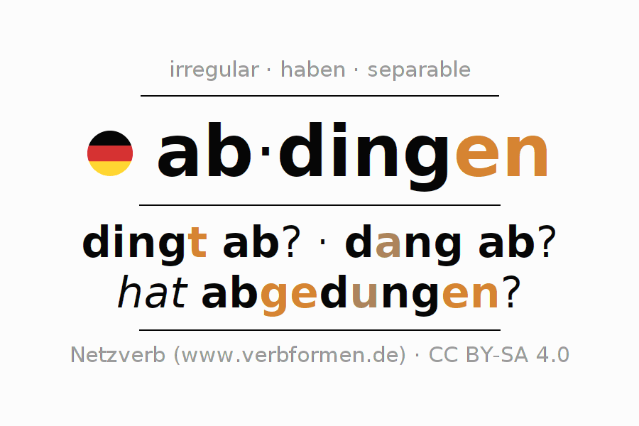 - Future: werde ich abdingen?, wirst du abdingen?, wird er abdingen?, werden wir abdingen?, werdet ihr abdingen?, werden sie abdingen?