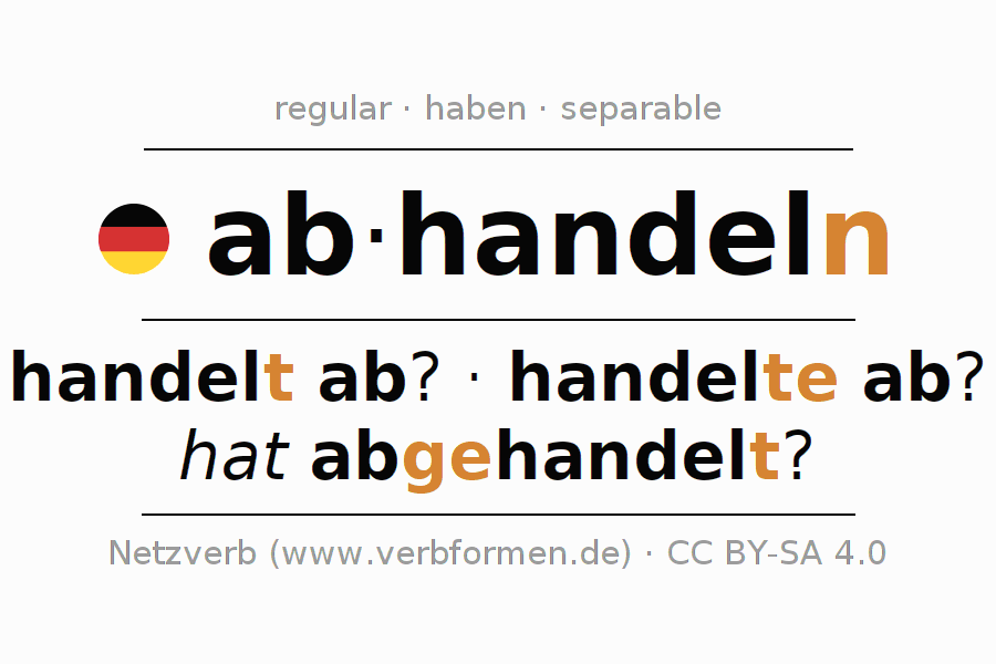 - Present: hand(e)l(e) (du) ab, handeln wir ab, handelt (ihr) ab, handeln Sie ab