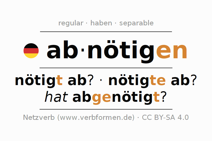 - Perfect: habe ich abgenötigt?, hast du abgenötigt?, hat er abgenötigt?, haben wir abgenötigt?, habt ihr abgenötigt?, haben sie abgenötigt?