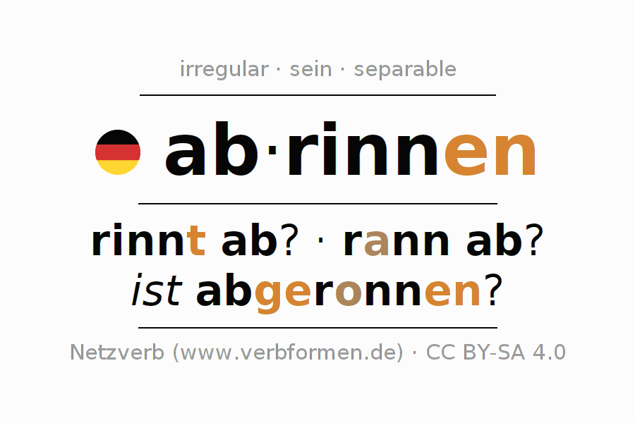 - Future: werde ich abrinnen?, wirst du abrinnen?, wird er abrinnen?, werden wir abrinnen?, werdet ihr abrinnen?, werden sie abrinnen?