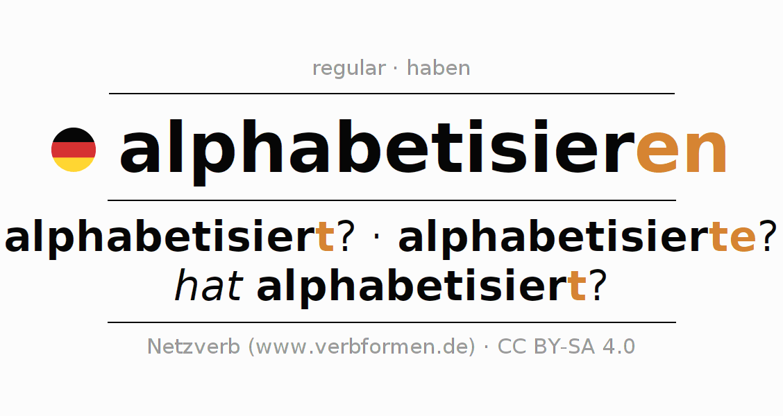 - Present: alphabetisier(e) (du), alphabetisieren wir, alphabetisiert (ihr), alphabetisieren Sie