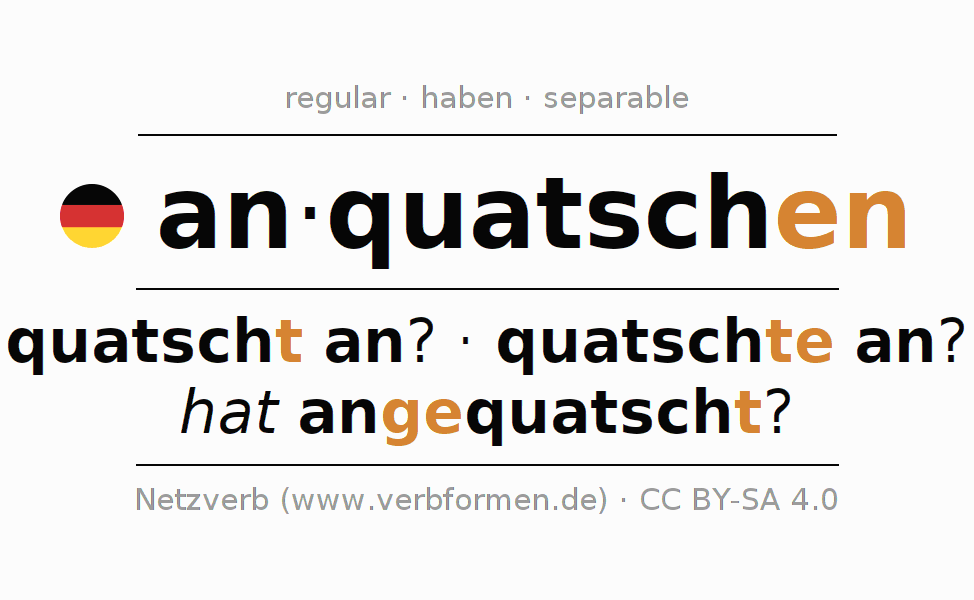 - Present: quatsch(e) (du) an, quatschen wir an, quatscht (ihr) an, quatschen Sie an