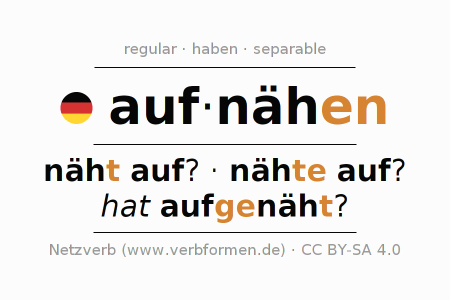 Clear online presentation of the verb 'auf·nähen' including all verb forms. Therfore, the flection of the verb auf·nähen can be useful for homework, tests, exams, German lessons in school, learning German, during studies and adult education. Especially for people learning German it is essential to know the correct flection of a verb (näht auf? - nähte auf? - hat aufgenäht?).