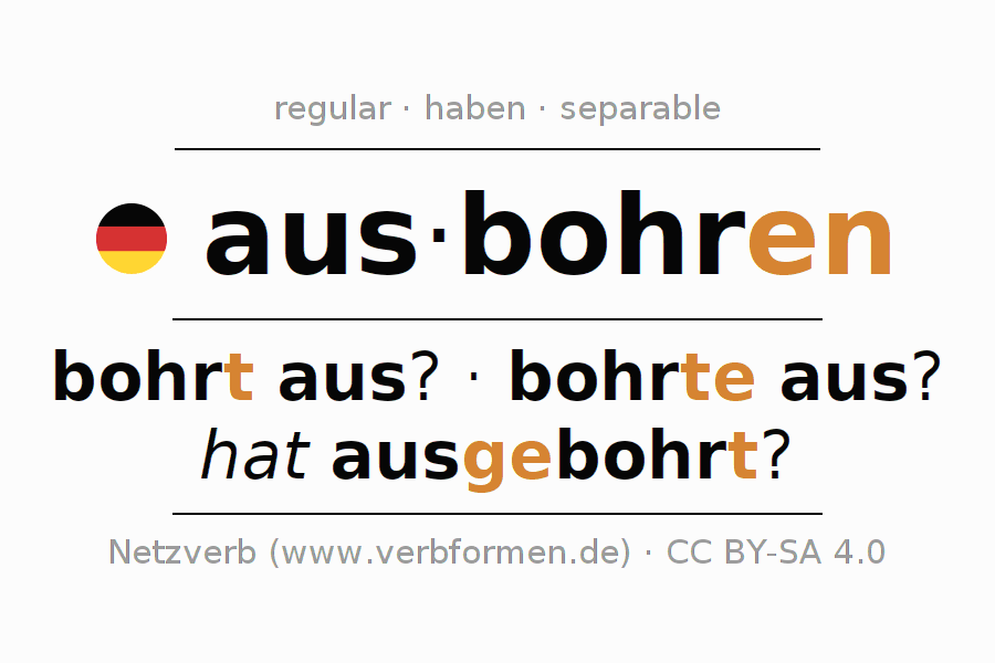 - Present: bohr(e) (du) aus, bohren wir aus, bohrt (ihr) aus, bohren Sie aus