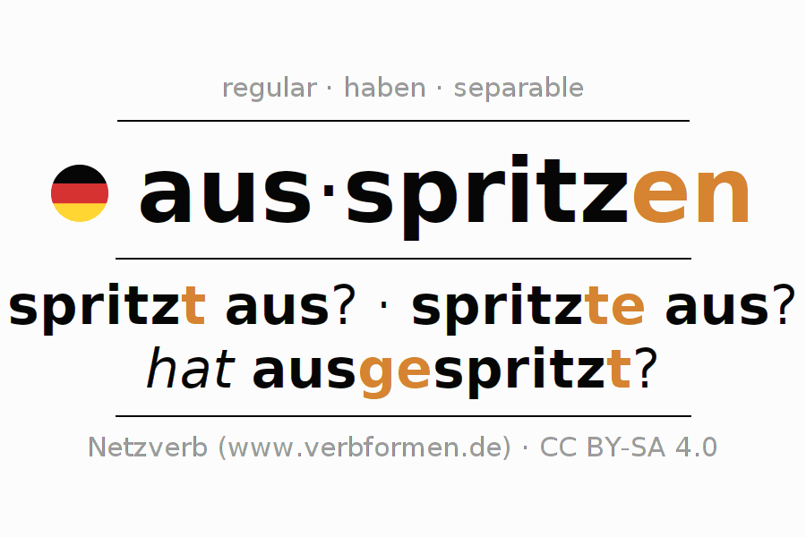 - Present: spritz(e) (du) aus, spritzen wir aus, spritzt (ihr) aus, spritzen Sie aus