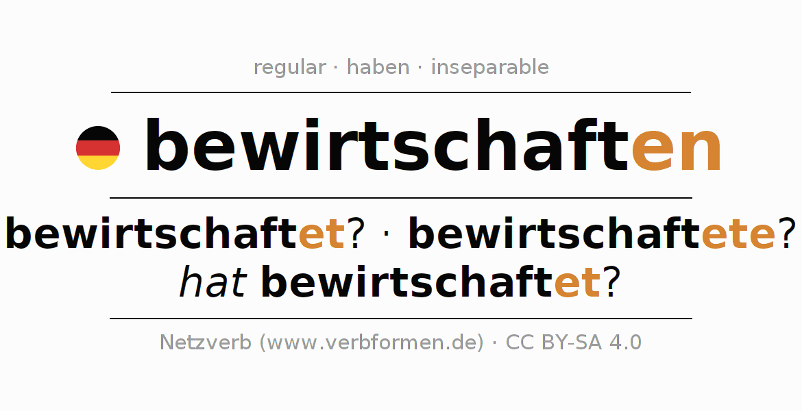 - Future: werde ich bewirtschaften?, wirst du bewirtschaften?, wird er bewirtschaften?, werden wir bewirtschaften?, werdet ihr bewirtschaften?, werden sie bewirtschaften?