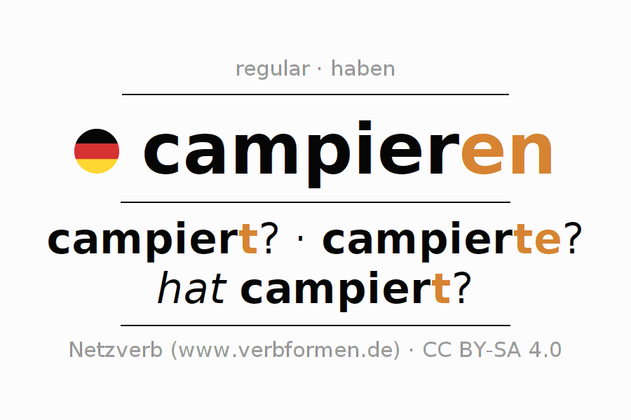 Clear online presentation of the verb 'campieren' including all verb forms. Therfore, the flection of the verb campieren can be useful for homework, tests, exams, German lessons in school, learning German, during studies and adult education. Especially for people learning German it is essential to know the correct flection of a verb (campiert? - campierte? - hat campiert?).