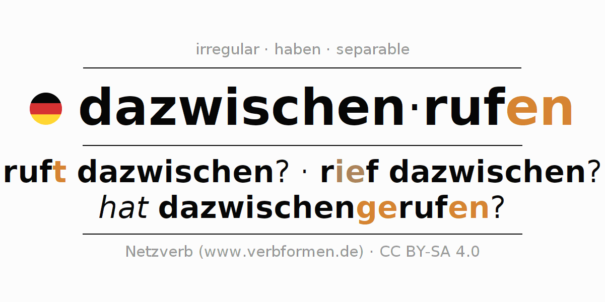 - Present: ruf(e) (du) dazwischen, rufen wir dazwischen, ruft (ihr) dazwischen, rufen Sie dazwischen