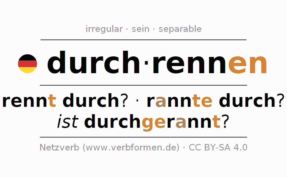 - Present: renn(e) (du) durch, rennen wir durch, rennt (ihr) durch, rennen Sie durch