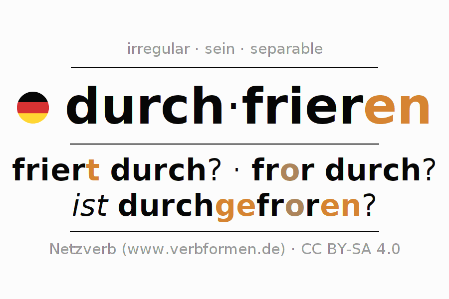 - Future: werde ich durchfrieren?, wirst du durchfrieren?, wird er durchfrieren?, werden wir durchfrieren?, werdet ihr durchfrieren?, werden sie durchfrieren?