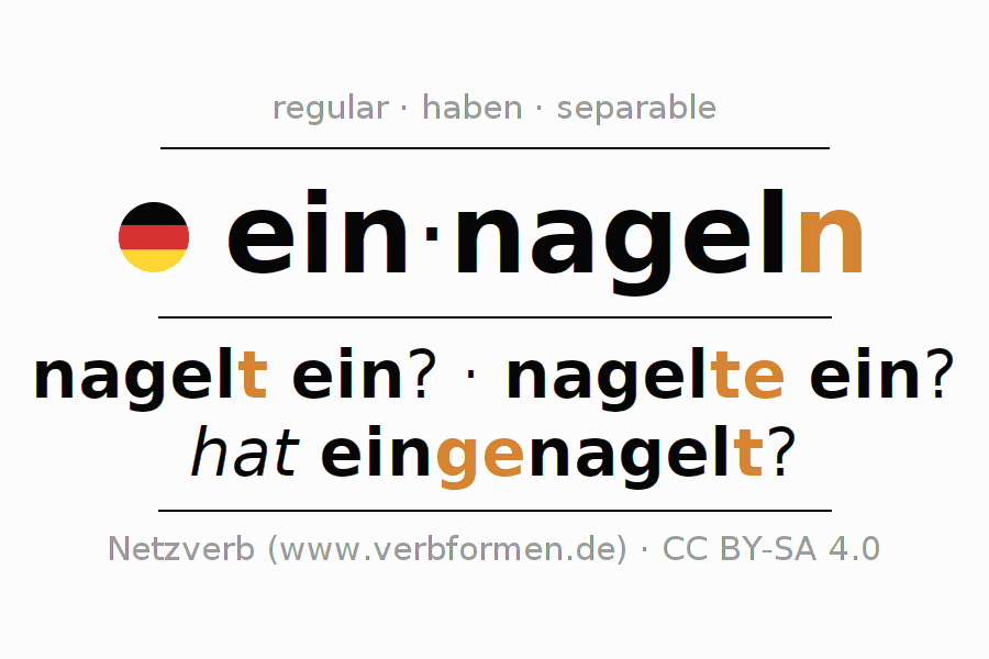 - Future: werde ich einnageln?, werdest du einnageln?, werde er einnageln?, werden wir einnageln?, werdet ihr einnageln?, werden sie einnageln?