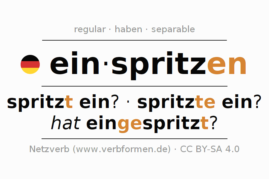 - Present: spritz(e) (du) ein, spritzen wir ein, spritzt (ihr) ein, spritzen Sie ein