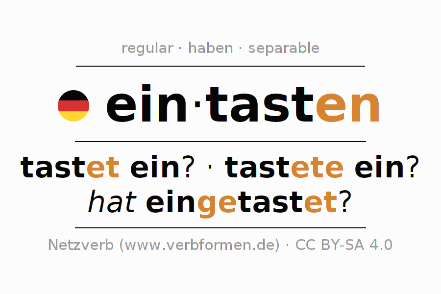 - Present: tast(e) (du) ein, tasten wir ein, tastet (ihr) ein, tasten Sie ein
