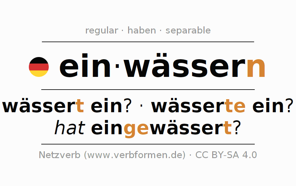 - Future: werde ich einwässern?, wirst du einwässern?, wird er einwässern?, werden wir einwässern?, werdet ihr einwässern?, werden sie einwässern?