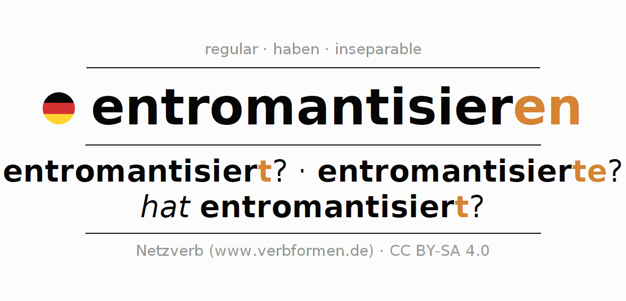 Clear online presentation of the verb 'entromantisieren' including all verb forms. Therfore, the flection of the verb entromantisieren can be useful for homework, tests, exams, German lessons in school, learning German, during studies and adult education. Especially for people learning German it is essential to know the correct flection of a verb (entromantisiert? - entromantisierte? - hat entromantisiert?).