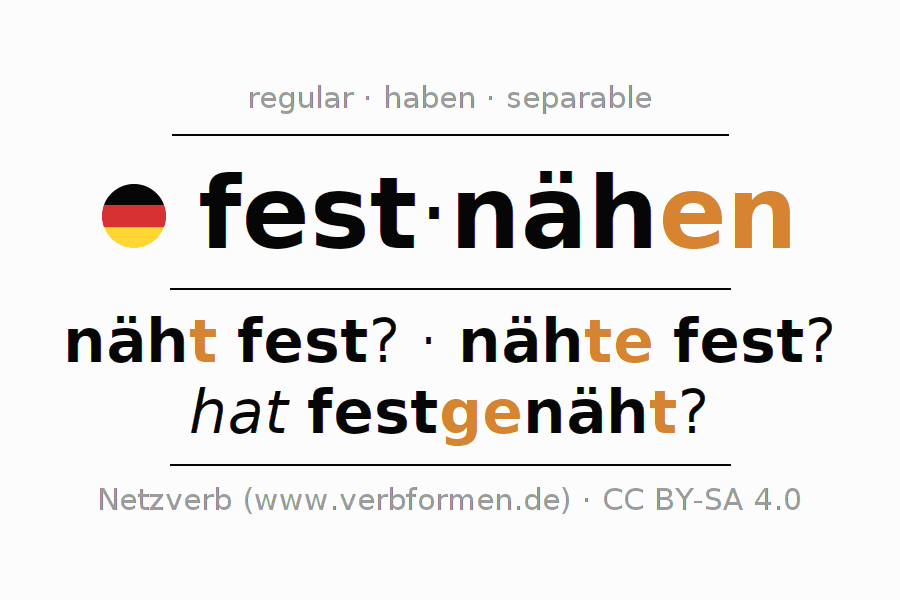 - Present: näh(e) (du) fest, näh(e)n wir fest, näht (ihr) fest, näh(e)n Sie fest