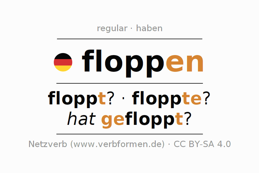 - Present: flopp(e) ich?, floppst du?, floppt er?, floppen wir?, floppt ihr?, floppen sie?