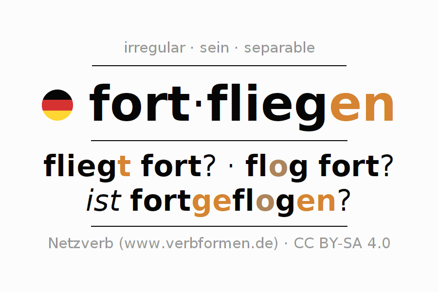 - Present: flieg(e) (du) fort, fliegen wir fort, fliegt (ihr) fort, fliegen Sie fort
