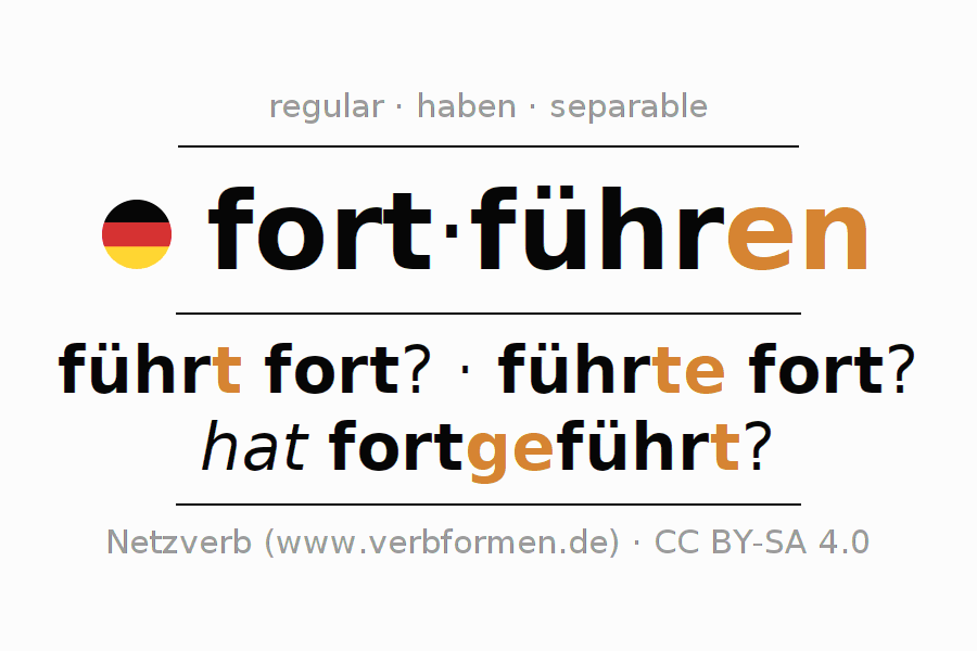 Clear online presentation of the verb 'fort·führen' including all verb forms. Therfore, the flection of the verb fort·führen can be useful for homework, tests, exams, German lessons in school, learning German, during studies and adult education. Especially for people learning German it is essential to know the correct flection of a verb (führt fort? - führte fort? - hat fortgeführt?).