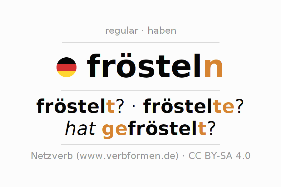 - Future Perfect: werde ich gefröstelt haben?, wirst du gefröstelt haben?, wird er gefröstelt haben?, werden wir gefröstelt haben?, werdet ihr gefröstelt haben?, werden sie gefröstelt haben?