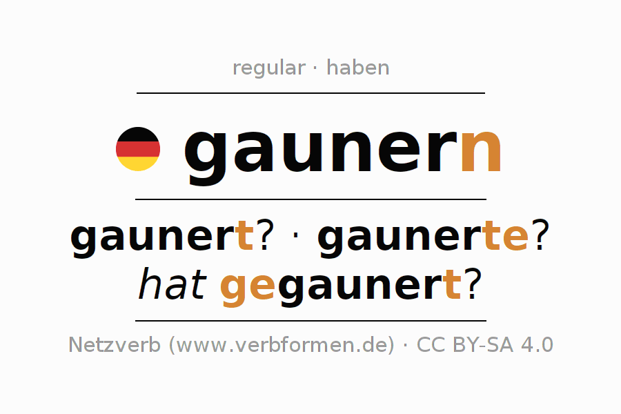 - Imperfect: gaunerte ich?, gaunertest du?, gaunerte er?, gaunerten wir?, gaunertet ihr?, gaunerten sie?