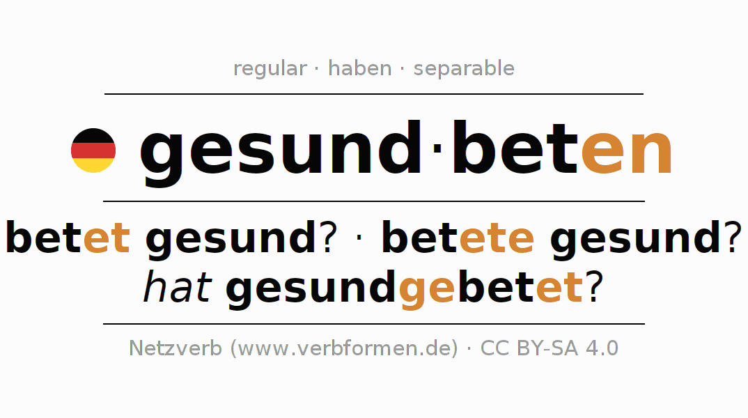 - Present: bet(e) (du) gesund, beten wir gesund, betet (ihr) gesund, beten Sie gesund