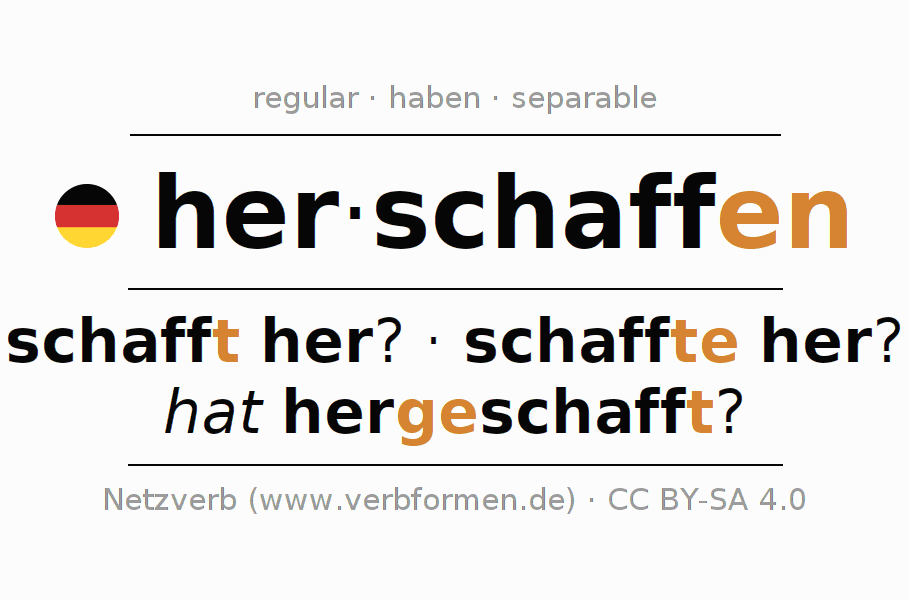 - Future: werde ich herschaffen?, werdest du herschaffen?, werde er herschaffen?, werden wir herschaffen?, werdet ihr herschaffen?, werden sie herschaffen?