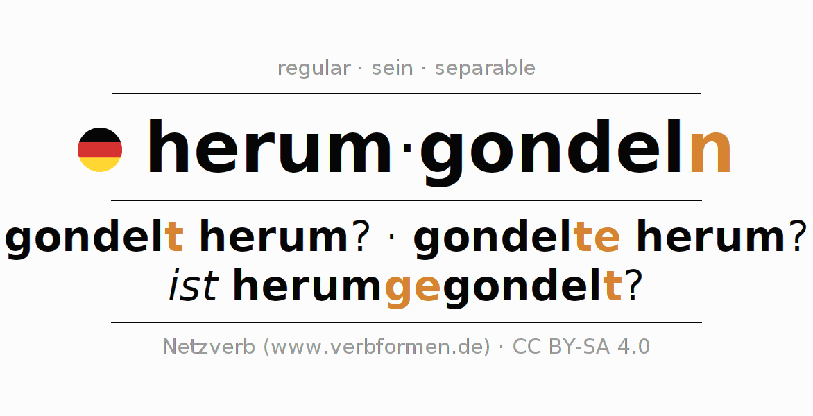- Present: gond(e)l(e) (du) herum, gondeln wir herum, gondelt (ihr) herum, gondeln Sie herum