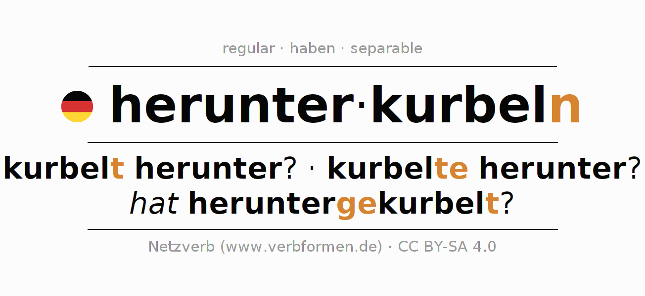 Clear online presentation of the verb 'herunter·kurbeln' including all verb forms. Therfore, the flection of the verb herunter·kurbeln can be useful for homework, tests, exams, German lessons in school, learning German, during studies and adult education. Especially for people learning German it is essential to know the correct flection of a verb (kurbelt herunter? - kurbelte herunter? - hat heruntergekurbelt?).