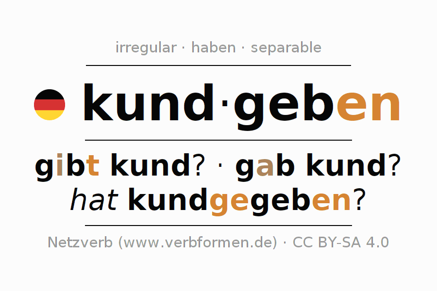 Clear online presentation of the verb 'kund·geben' including all verb forms. Therfore, the flection of the verb kund·geben can be useful for homework, tests, exams, German lessons in school, learning German, during studies and adult education. Especially for people learning German it is essential to know the correct flection of a verb (gibt kund? - gab kund? - hat kundgegeben?).