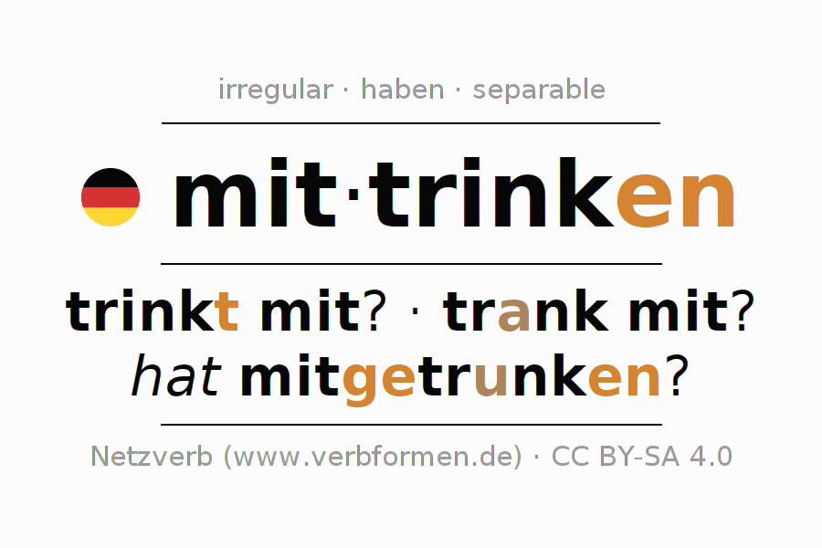 The conjugation of the verb mittrinken (drink together, share a drink) is irregular. Basic forms are trinkt mit?, trank mit? and hat mitgetrunken?. The stem vowels are i - a - u. The auxiliary verb of mittrinken is haben. First syllable mit- of mittrinken is separable. The flection is in Active and the use as Interrogative. For a better understanding, countless examples of the verb mittrinken are available. For practicing and consolidating, there are also free worksheets for mittrinken. You can not just mittrinken conjugate, but all German verbs. Comments ☆