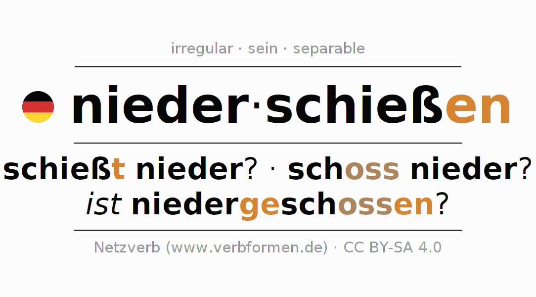 - Future: werde ich niederschießen?, wirst du niederschießen?, wird er niederschießen?, werden wir niederschießen?, werdet ihr niederschießen?, werden sie niederschießen?
