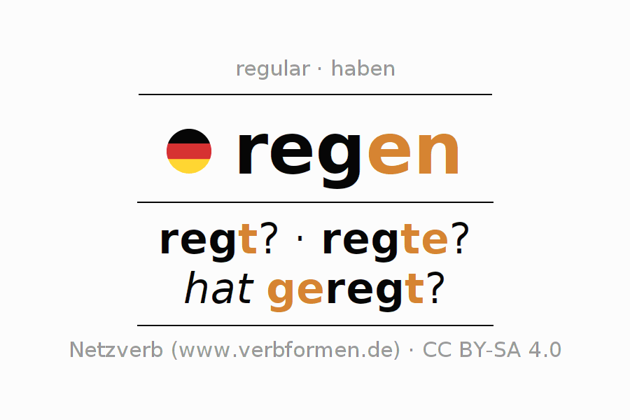 Clear online presentation of the verb 'regen' including all verb forms. Therfore, the flection of the verb regen can be useful for homework, tests, exams, German lessons in school, learning German, during studies and adult education. Especially for people learning German it is essential to know the correct flection of a verb (regt? - regte? - hat geregt?).