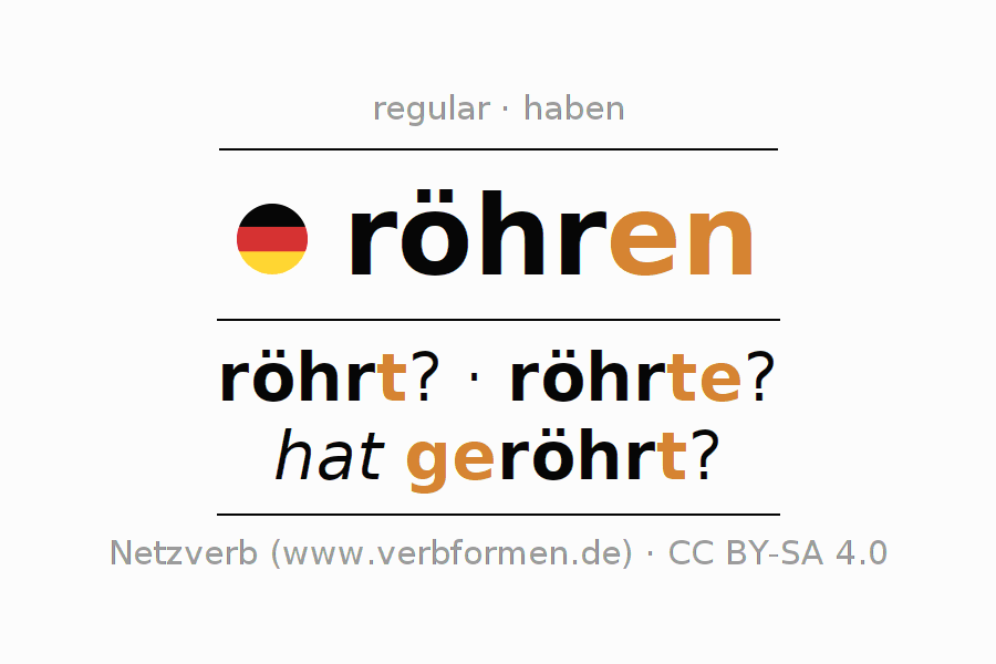 Clear online presentation of the verb 'röhren' including all verb forms. Therfore, the flection of the verb röhren can be useful for homework, tests, exams, German lessons in school, learning German, during studies and adult education. Especially for people learning German it is essential to know the correct flection of a verb (röhrt? - röhrte? - hat geröhrt?).