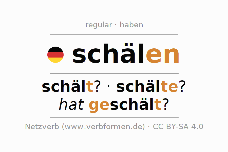 Clear online presentation of the verb 'schälen' including all verb forms. Therfore, the flection of the verb schälen can be useful for homework, tests, exams, German lessons in school, learning German, during studies and adult education. Especially for people learning German it is essential to know the correct flection of a verb (schält? - schälte? - hat geschält?).