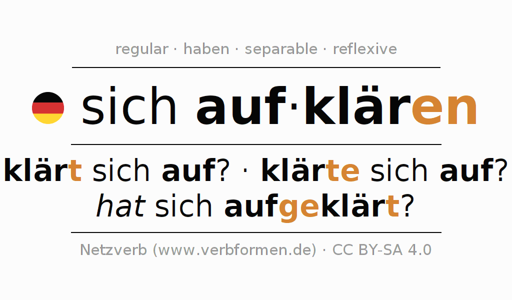 Clear online presentation of the verb 'sich auf·klären' including all verb forms. Therfore, the flection of the verb sich auf·klären can be useful for homework, tests, exams, German lessons in school, learning German, during studies and adult education. Especially for people learning German it is essential to know the correct flection of a verb (klärt sich auf? - klärte sich auf? - hat sich aufgeklärt?).