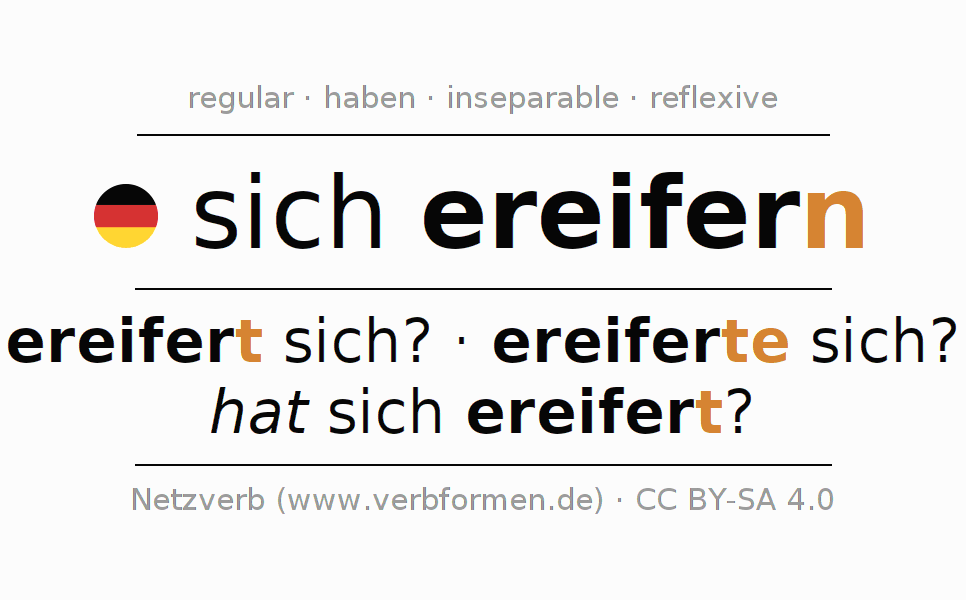 - Perfect: habe ich mir/mich ereifert?, hast du dir/dich ereifert?, hat er sich ereifert?, haben wir uns ereifert?, habt ihr euch ereifert?, haben sie sich ereifert?